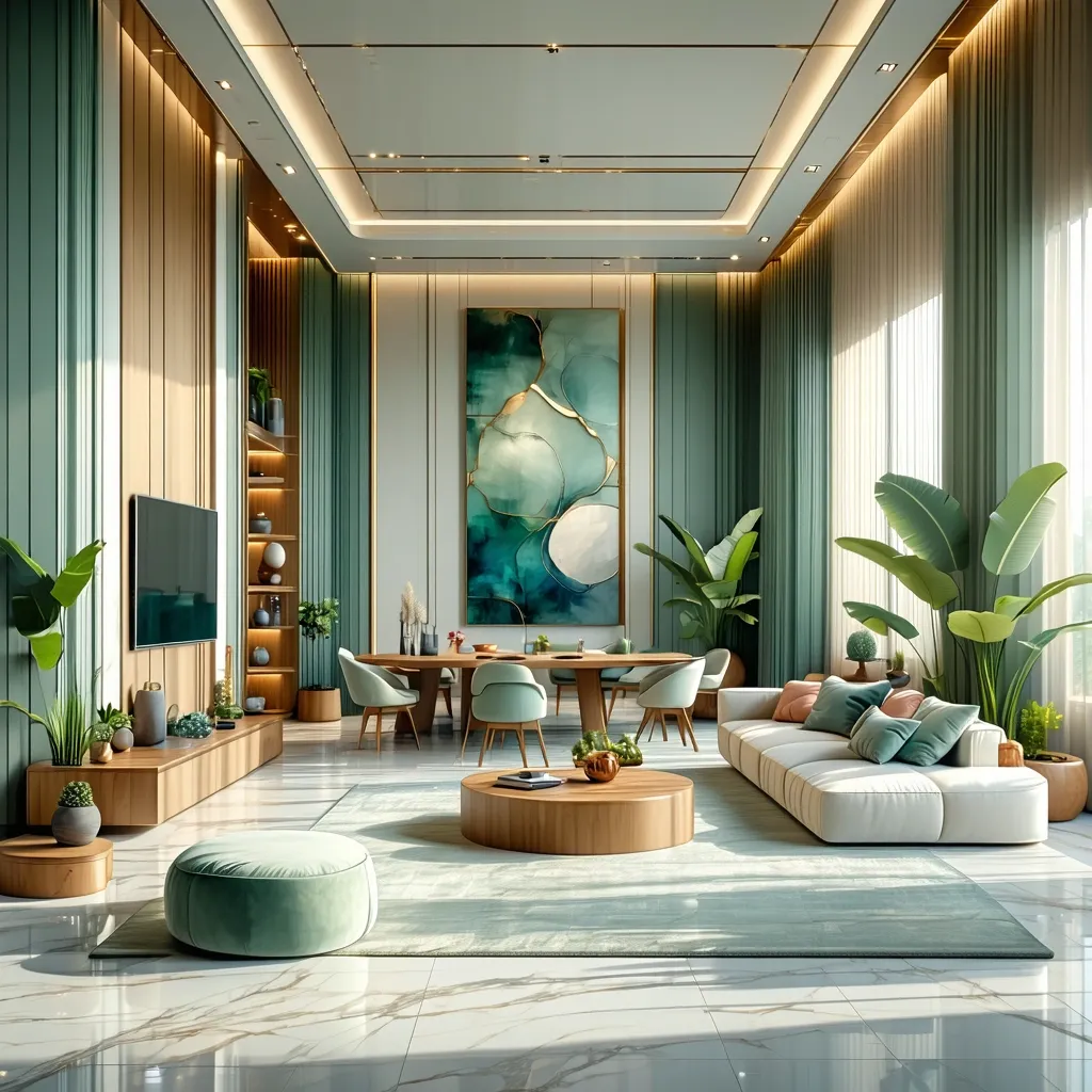- Зеленый + бежевый + золотой: Эко-стиль в столовой, повышает концентрацию.